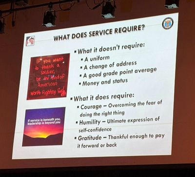 The student council president at North County High School of Anne Arundel County, just outside Baltimore, opens up the presentation in September 2016 as part of the Maryland’s Day to Serve initiative. “You don’t need to be smarter or richer to do great things,” Col. (ret.) Holshek told the underprivileged students, “You only need courage and humility – and that’s something we can all find.” This was Holshek’s first appearance in a series of “proof of concept” National Service Ride events in 2016-17. The project then ran into delays due to family and overseas commitments and the COVID-19 pandemic. (Photo courtesy of North County High School of Anne Arundel County.)
